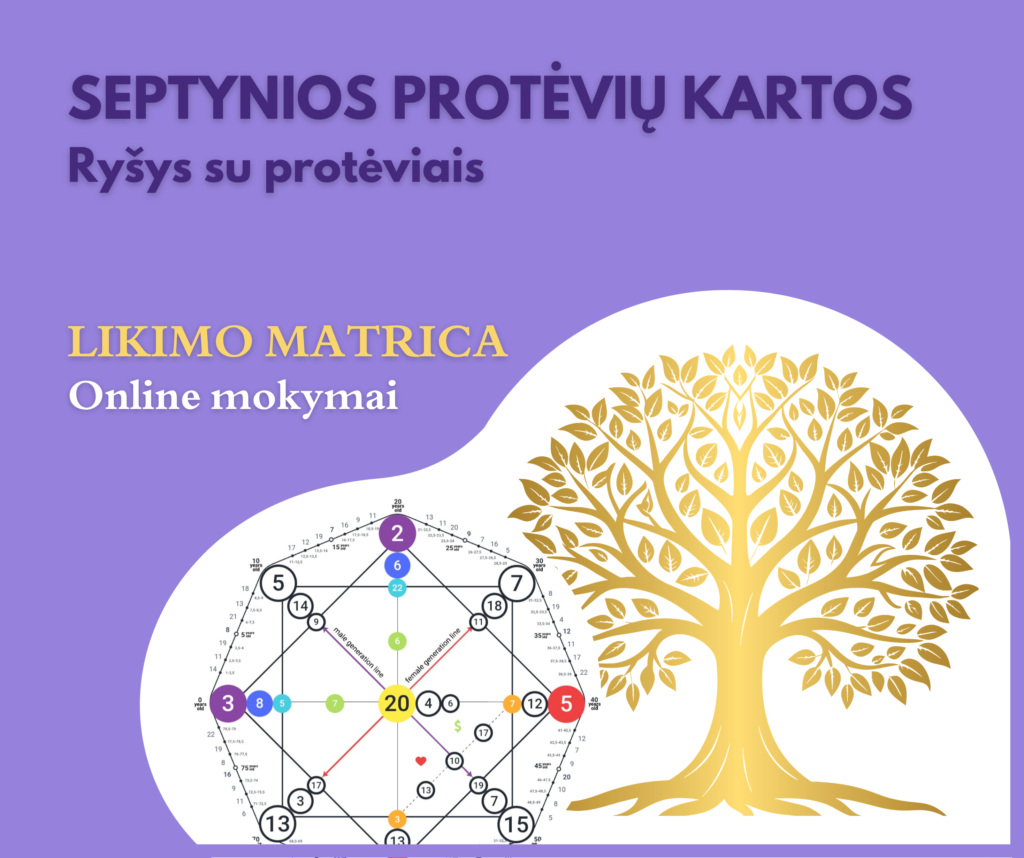 Mokymuose sužinosite kaip apskaičiuoti giminės kanalus Likimo Matricoje, nustatyti energijas kiekvienai Tėvo ir Motinos giminės kartai, dirbti su iš praeities per giminės kanalus ateinančiu karingumu, susipažinsite su autorinėmis metodikomis darbui su giminės karma bei protėvių palaiminimo palikuonims principu. Kiekvienas dalyvis gaus metodinę knygą „7 Protėvių kartos“, praktinius įrankius darbui su protėviais ir kitą metodinę medžiagą, […]